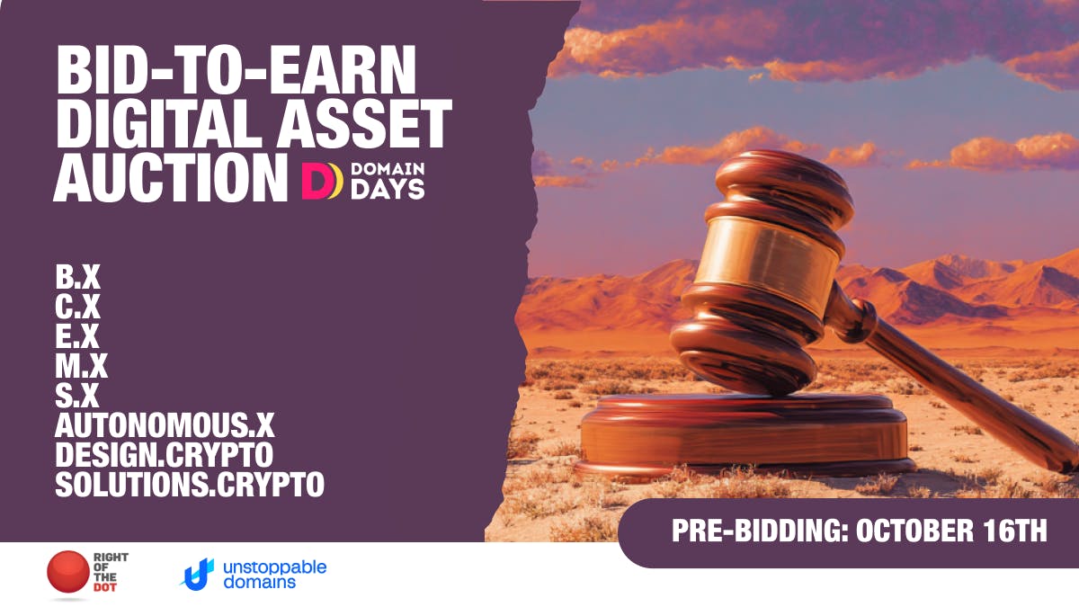 The stage is set. On October 22nd, we’re joining RIGHToftheDOT’s Bid-To-Earn online digital asset auction during Dubai Domain Days 2025. This global online auction powered by GBM will feature the best-of-the-best premium domains from the Unstoppable vault, and with Bid-to-Earn, whether you win the name or not, your participation is rewarded. Pre-bidding starts October 16th.