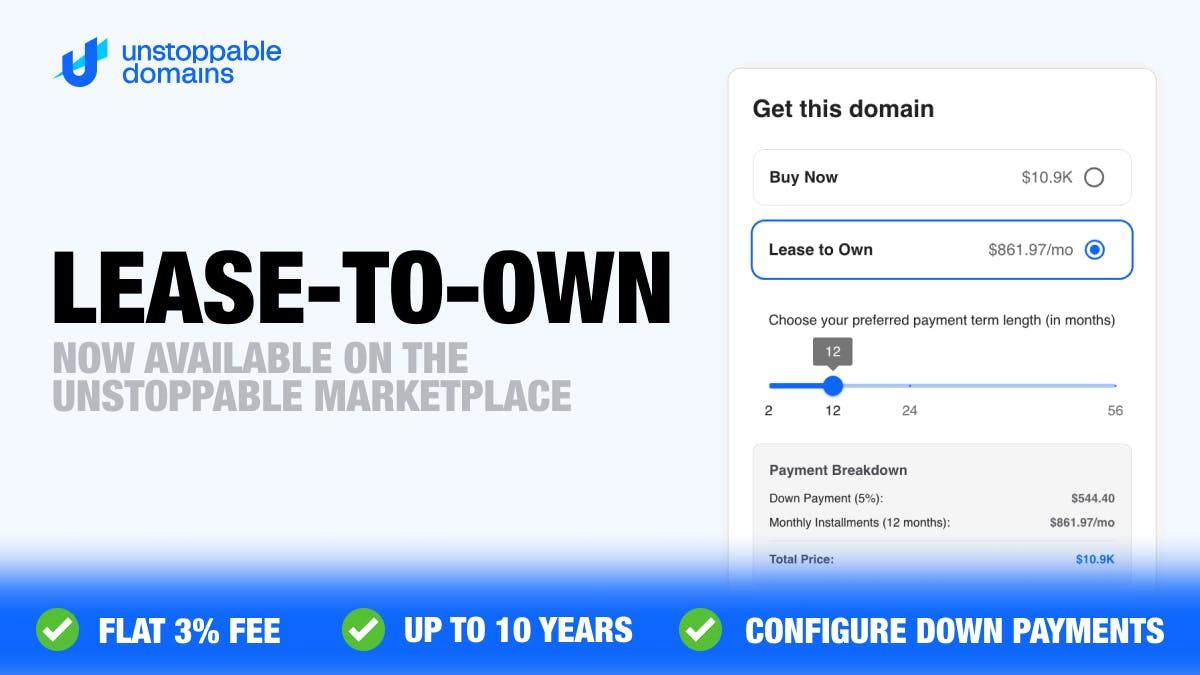 At Unstoppable Domains, we’re always looking for ways to make domain ownership and digital identity more accessible for buyers, and more rewarding for sellers. Today, we’re excited to announce a brand new feature: Lease-to-Own (LTO).